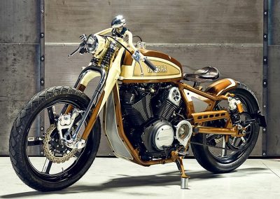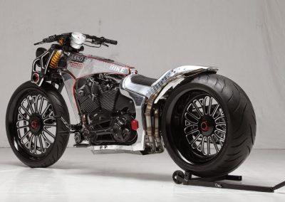 We supplied for this project: Indianapolis Special triple tree, Indianapolis headlight, Indianapolis instrument housing, Mini hand controls with special order oil tanks, Mimas grips set, Special order airbox billet cover, Special order side radiator, Special order side gas tank cover