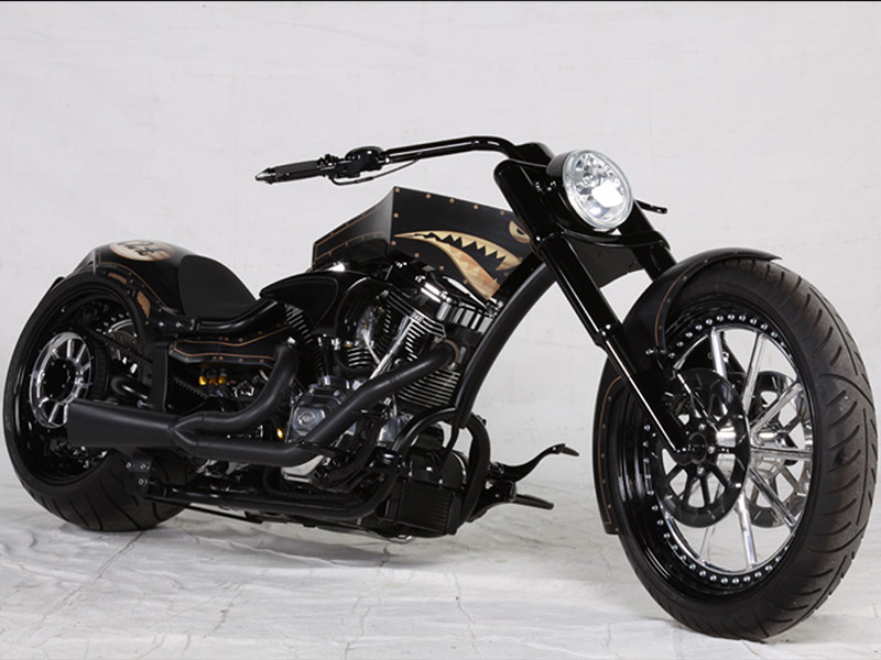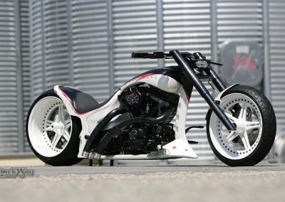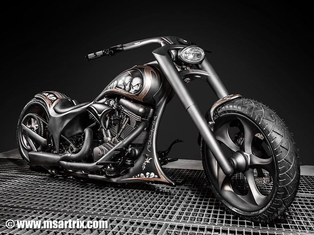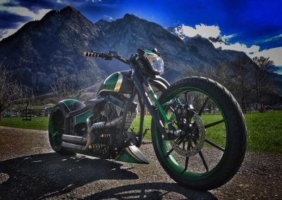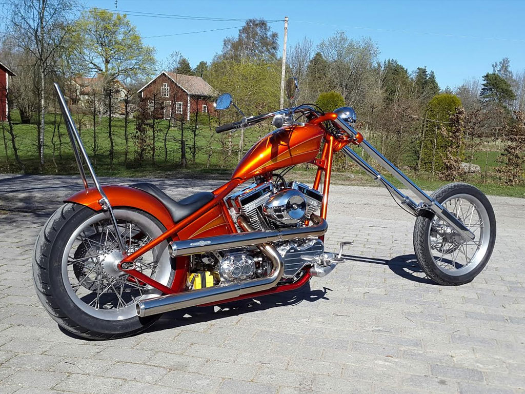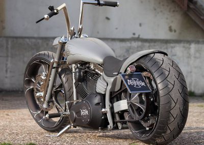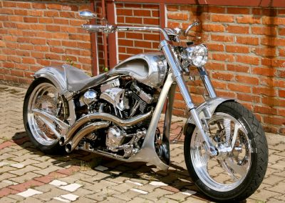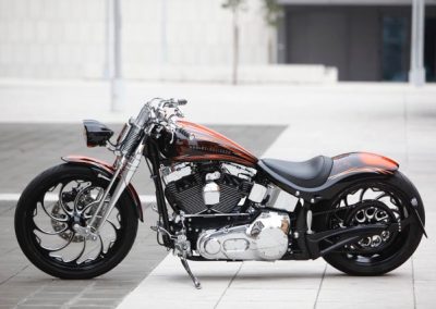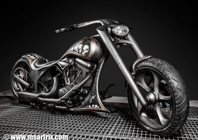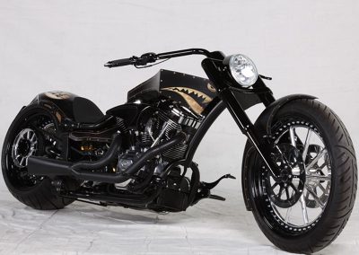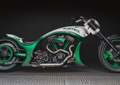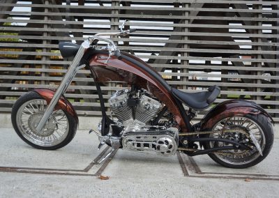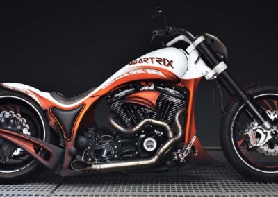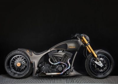 We supplied for this project: stargate air cleaner, ellipse hand and forward controls, delta grips, apollo 13 mirrors, MB clutch housing, MB Twin Cam cover